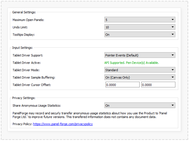 As this interface is provided by Microsoft and is fully integrated into Windows, it provides compatibility with any hardware that supports these versions of Windows. PanelForge has been tested successfully with Devices from 'Wacom', 'Huion' and 'Microsoft Surface'.