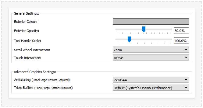 This may be useful when using PanelForge on computer systems with less powerful graphics acceleration hardware or interacting with very complex scene geometry.