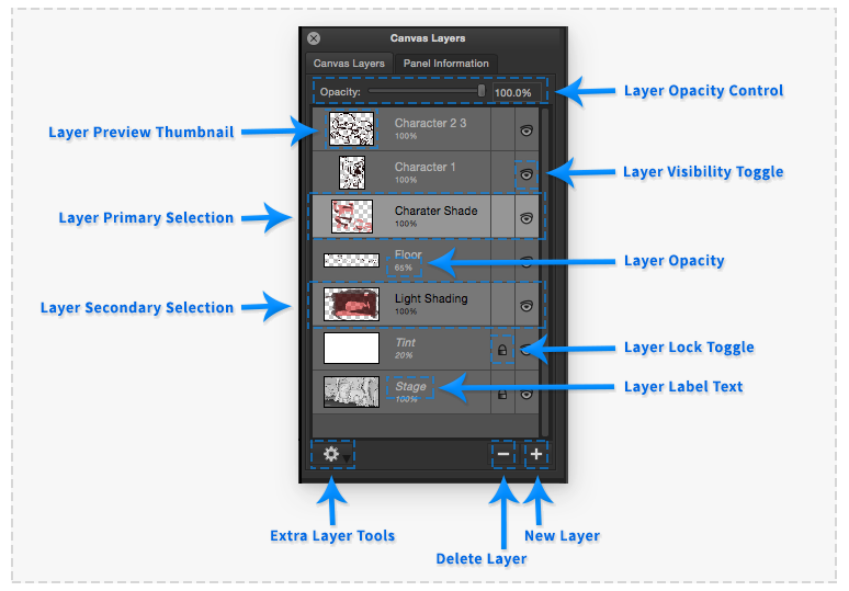 The 'Canvas Layers' palette provides the functionality to organise and adjust the image layers which are composited together to form the current Panel's Canvas.