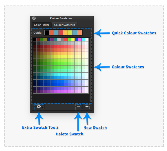 The palette is split into two separate areas, the main large area of Colour Swatches and a smaller series of eight Quick Colour Swatches that are also shown in the Canvas Workspace for constant access.