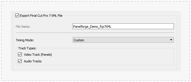 • Audio Tracks - For each audio track in the current PanelForge Project timeline a corresponding audio track will be exported.