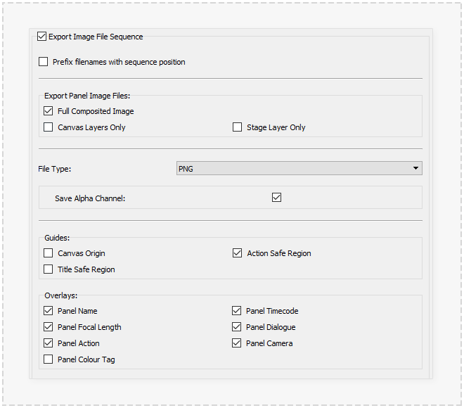 The 'Image Sequence' tab of the Export dialog window provides the options to export a series of image files. Each exported image file contains the composited output of the Canvas view including the Stage Layer and optionally any Guide and Text overlays.