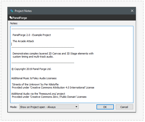 When a PanelForge Project is open this dialog window can be accessed via the Project->Project Notes... main menu item.