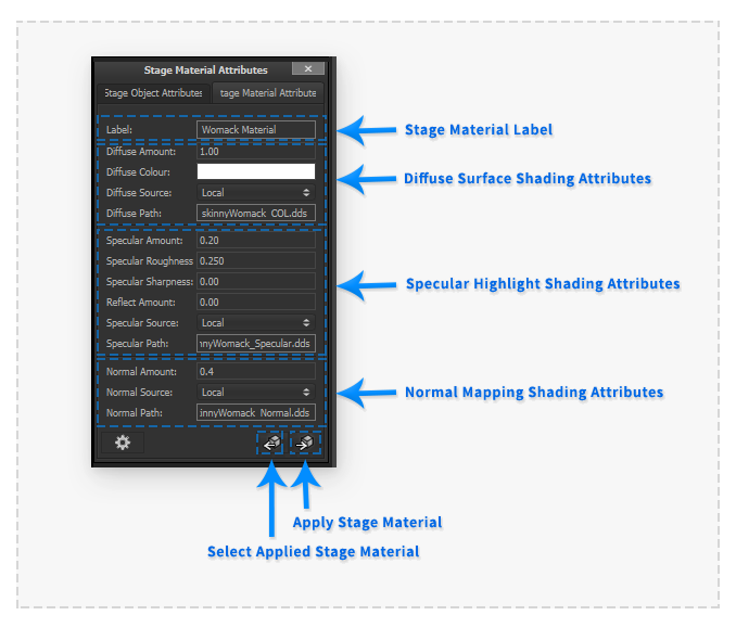 Pressing this button will apply the currently selected Stage Material (Attributes shown in the Palette) to the currently selected Stage Objects.