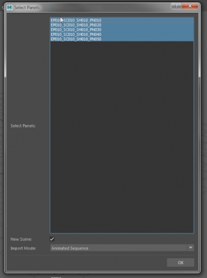 The 'Import Mode' is kept to the default 'Animated Sequence' value. This will create a minimal set of referenced Maya geometry and Cameras that will be animated based on Object placement in the PanelForge Panel Stages.