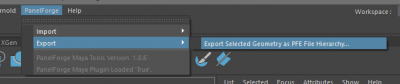 Using the PanelForge Python Script the 'Export Selected Geometry as PFE File Hierarchy…' option in the main 'PanelForge' Maya menu will be available. This feature will automatically export a Hierarchy of mesh objects in Maya to the corresponding file structure on disk. This directory file structure can then be imported into PanelForge.