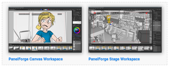 The PanelForge user experience consists of a timeline of Storyboard Panel elements that combines a 2D bitmap drawing Canvas workspace and a 3D object Stage layout workspace.