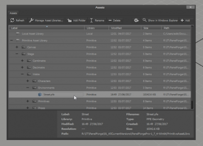 A PanelForge Stage is built by populating it with Objects made of 3D geometry. The PanelForge 'Assets' Palette window manages Asset files of Stage Objects allowing them to be quickly imported.