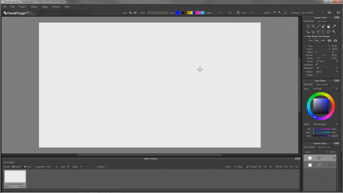 When a PanelForge Project is first created or opened the 'Canvas Workspace' is displayed. The 'Canvas Workspace' provides familiar 2D drawing and editing functionality. Much of this functionality is accessible via the Canvas Tools, Colour Picker and Canvas Layers palettes to the right of the Workspace.